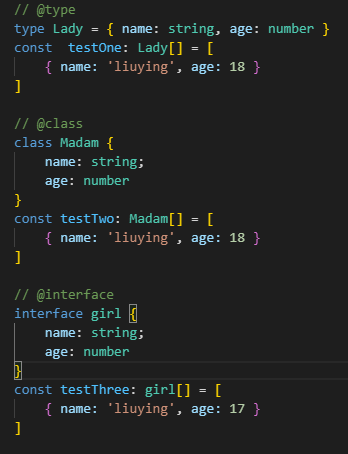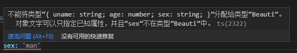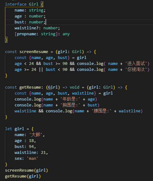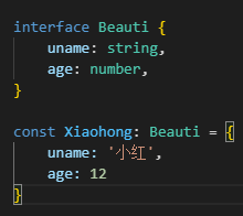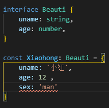 interface可以暂时理解为 “标准” ,后面会进行详细解释。也就是说对象 "Xiaohong" 的内部数据结构必须和 "interface" 所制定的标准结构一样,否则也会进行报错