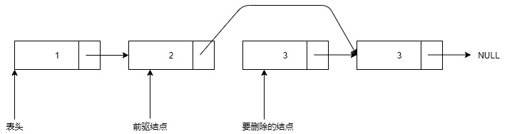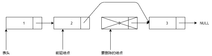 遍历链表,遍历时保存前驱结点的位置,当找到要删除的结点,将前驱结点next指针更新为被删除结点的next指针的值。