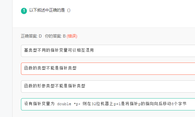 D:double*p类型的指针,指针大小是4个字节,但是double类型大小是8个字节,所以p+1,等于把p指向的地址偏移后8个字节