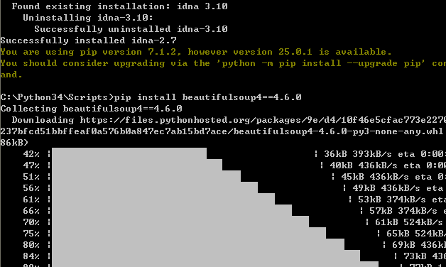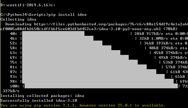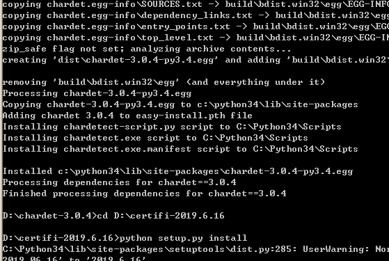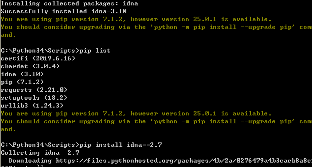 python3.4,旧东西加库,有点难,找不对版本。首先是requests,询问豆包requests-2.21.0可用,然后又是urllib,这个装错了,要1.25以下才行,在这里耽搁了很长时间。chardet-3.0.4,这个版本可用,chardet-3.0.2报错。certifi-2019.6.16一次成功,还有个idna27,用pip下载