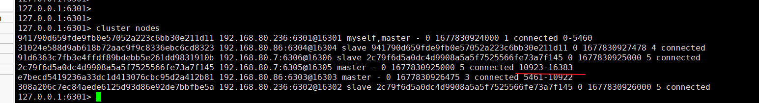 ./redis-cli --cluster create 192.168.80.236:6301 192.168.80.236:6302 192.168.80.86:6303 192.168.80.86:6304 192.168.80.7:6305 192.168.80.7:6306 -a 密码 --cluster-replicas