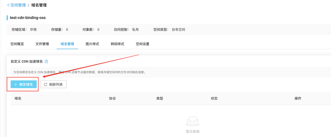 在新打开的标签页中输入已经备案的域名,点击创建,之后就可以使用这个域名来访问bucket的资源了,使用方式还是「域名/{bucket}/{objectName}」