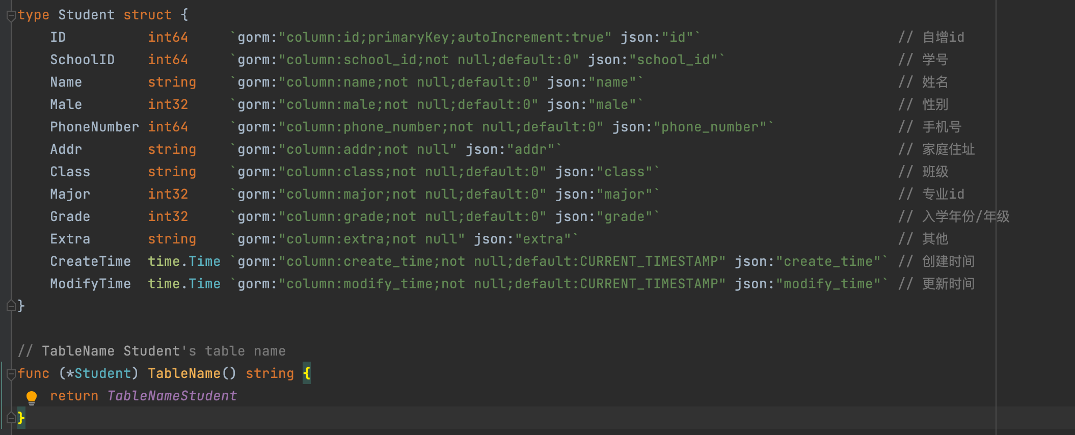 我们一般习惯于把 student.gen.go这个model 文件中的 '.gen' 字符串去除,也就是重命名为 student.go