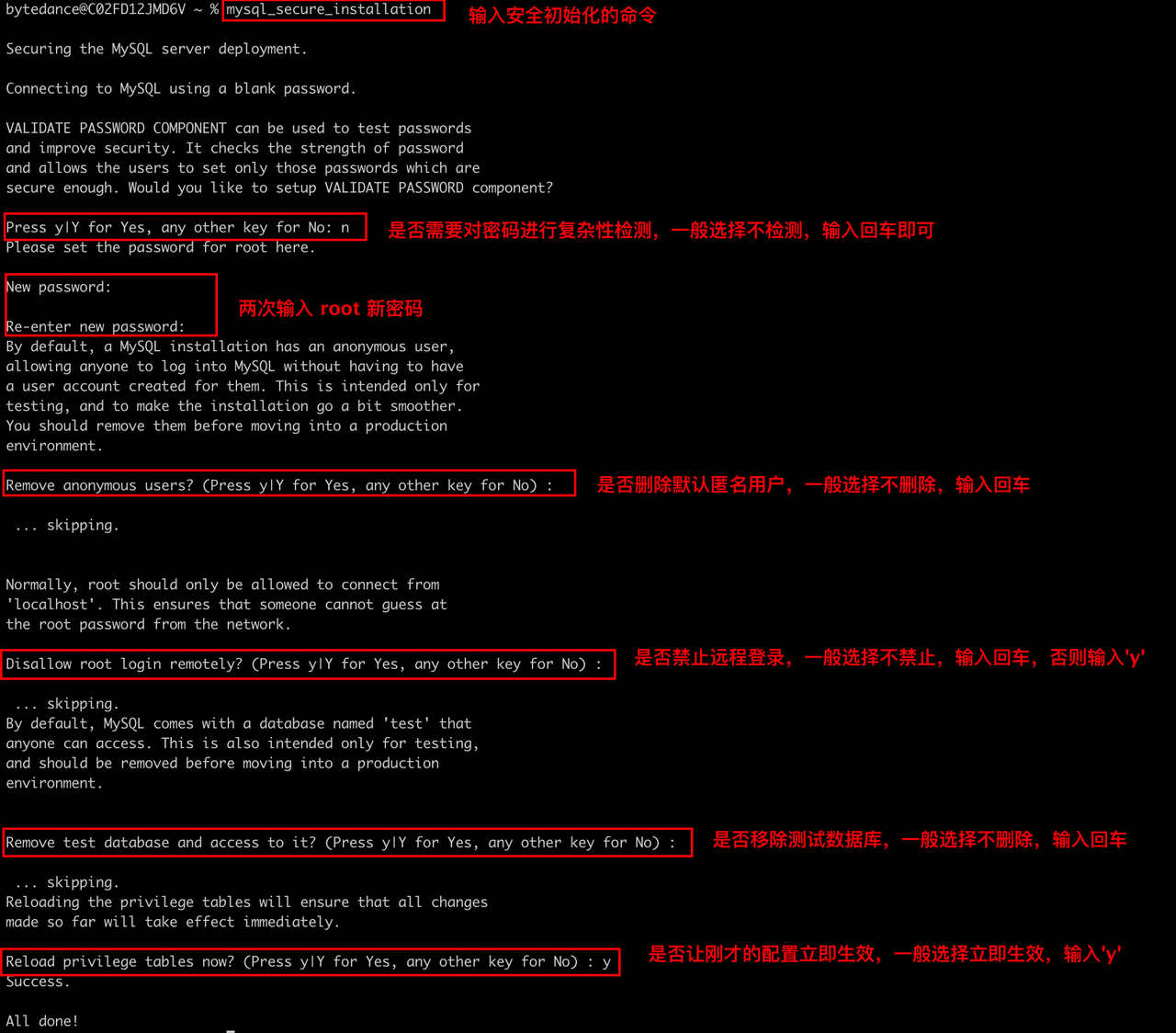 为了安全起见,虽然本地数据库只有我自己用,但是为了体现出我的专业性,我还是选择设置一下 root 密码。输入 mysql_secure_installation 开始初始化 MySQL,过程中的操作在下面都介绍的很清楚了。
