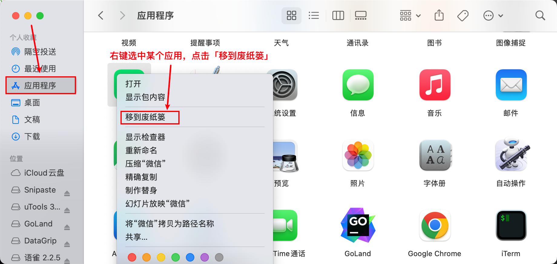 点击「访达」,点击左侧的「应用程序」,右键选中需要卸载的应用,点击「移到废纸篓」,搞定