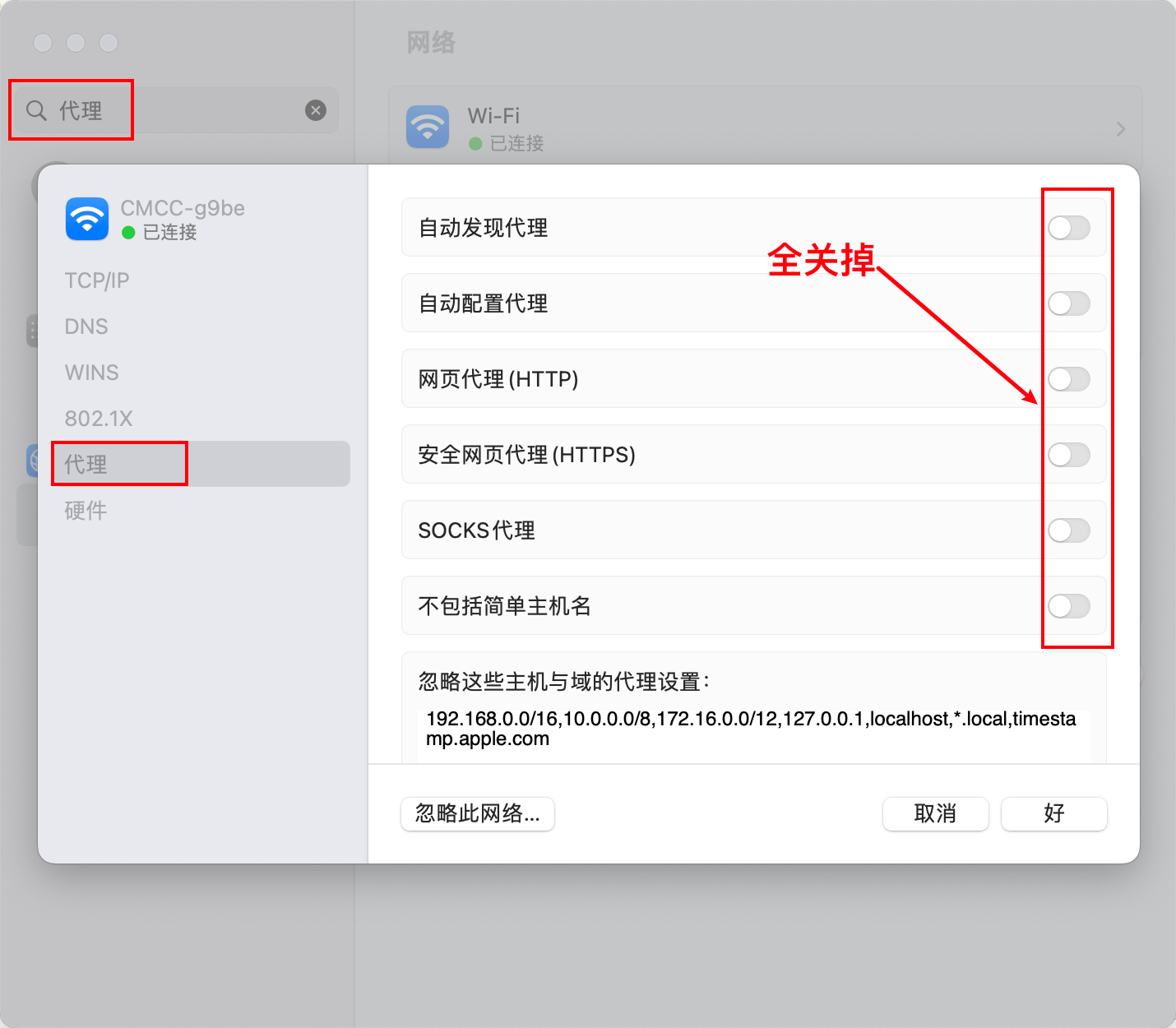 mac 突然连不上网,浏览器提示代理服务器相关问题,设置中搜索「代理」,关闭右侧所有开关。关闭之后不影响 charles 等软件的抓包功能。