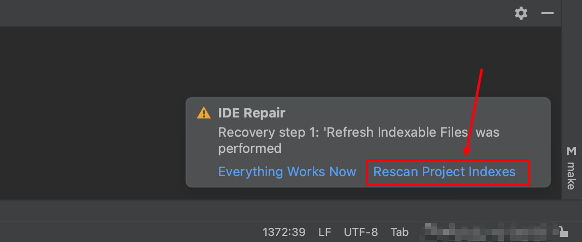 3、随后 Goland 右下角会出现一个提示框,「Recovery step 1: 'Refresh Indexable Files' was performed」,翻译是「已执行恢复步骤1:“刷新可索引文件”」,继续点击「Rescan Project Indexes」,将重新扫描项目的 index