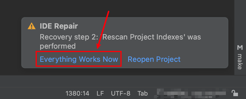 4、Goland 右下角仍会弹出一个小弹窗,提示已经执行了恢复过程的第二步,是否恢复正常,是否需要重新项目,如果已经恢复正常,点击「Everythings Works Now」就OK了,否则点击「Reopen Project」,然后继续往下看