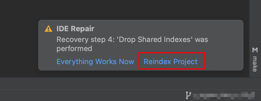 点击「Drop shared index」后,继续 Goland 右下角弹窗中的「Reindex Project」,到这里应该是可以恢复正常了,如果还是不正常,可以尝试看看其他教程,比如这个:goland包导入正常但是方法全部无法解析而编译又不报错
