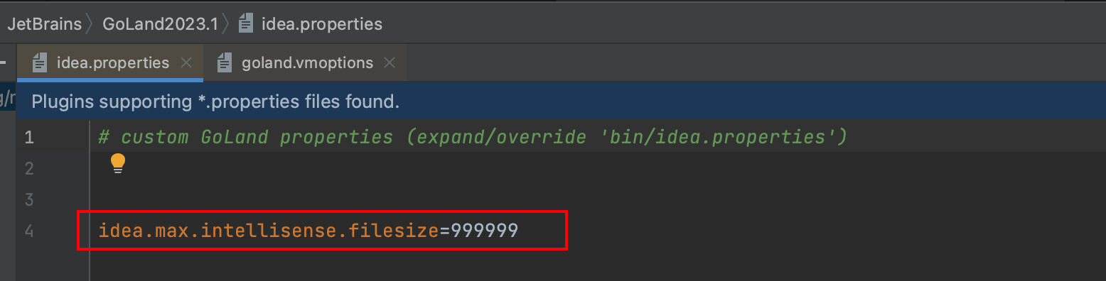 然后点击依次点击 Goland 功能栏「Help -> Edit Custom Properties」,把 idea.max.intellisense.filesize