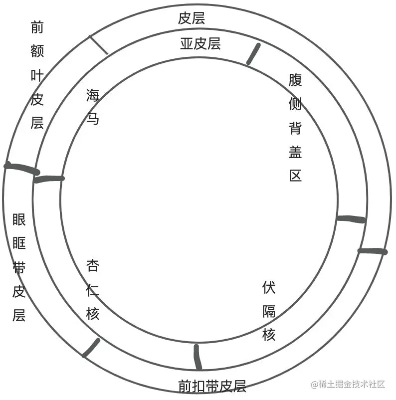 奖赏的神经环路主要由皮层 ( 前额叶皮层、眶额叶皮层、前扣带皮层 ) 和亚皮层区域 ( 腹侧背盖区、黑质、伏隔核、杏仁核、海马 ) 构成,而红核、外侧缰核、背侧纹状体和外侧下丘脑则参与了奖赏环路的调控作用。