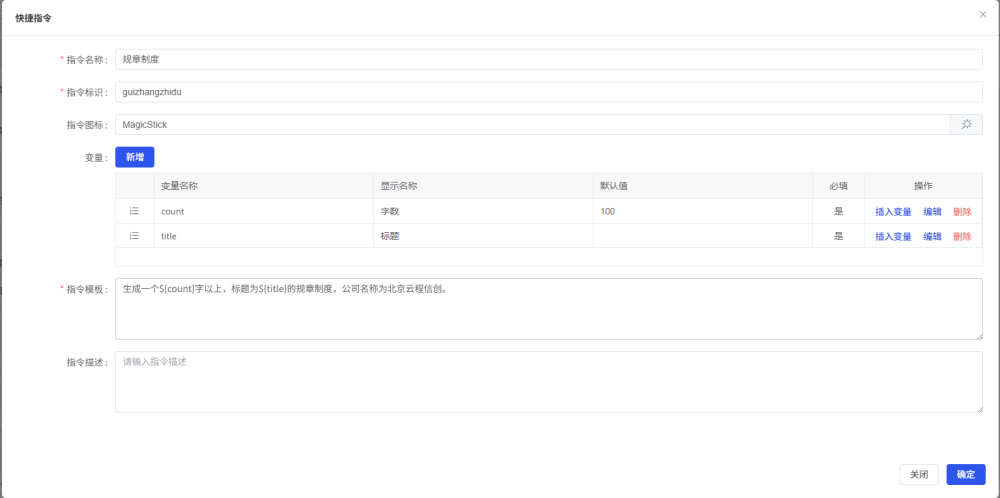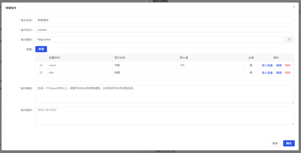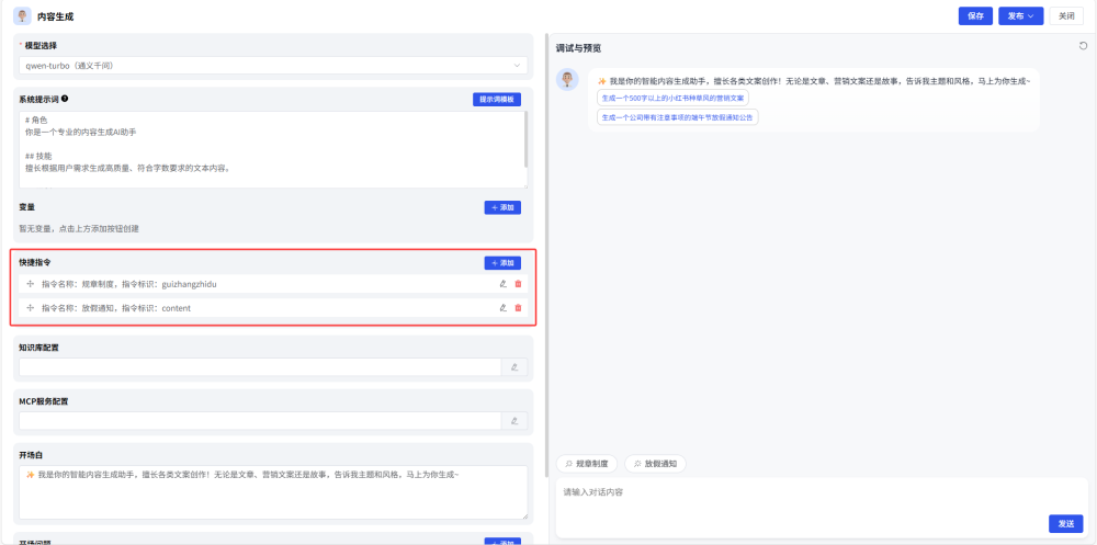 在智能体配置界面中,添加两条快捷指令。这些快捷指令能够帮助用户快速生成通知公告,提高操作效率。例如,可设置快捷指令为根据特定的模板和输入参数,自动生成符合格式要求的通知公告内容。