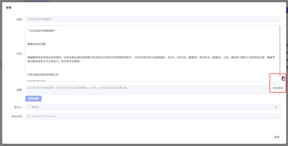 在完成通知内容的填写和摘要提取后,如需听取通知内容,点击【语音阅读】,系统会调用 TTS 模型,将表单中的通知内容以语音形式朗读出来,用户通过听力就可了解文档内容。