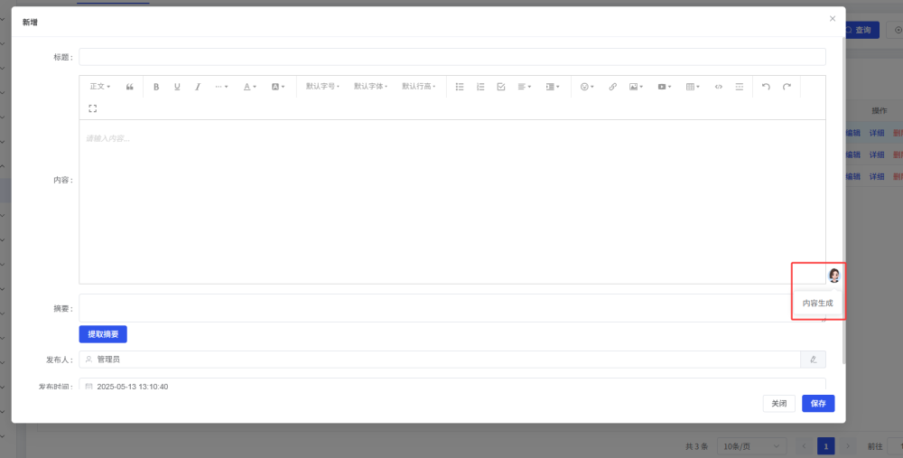 进入【通知公告】应用列表的表单新增界面,点击【内容生成】按钮,此时将弹出 AI 智能体对话框。