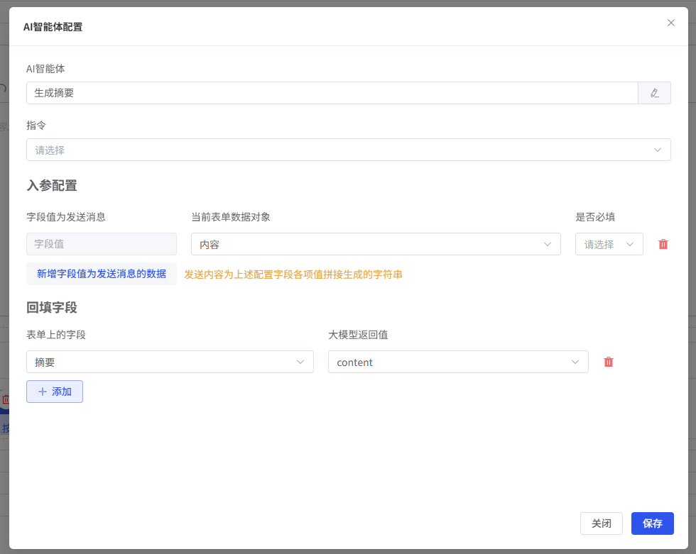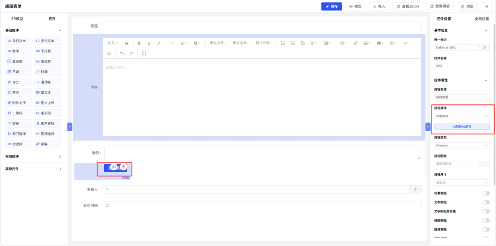 回到表单设计器,找到【提取摘要】按钮,为该按钮配置与上述新增智能体相关的信息。例如,设置点击按钮后,调用智能体对当前通知内容进行摘要提取,并将提取结果显示在指定位置。