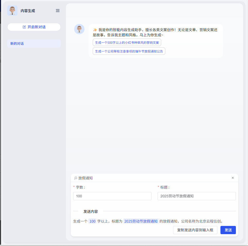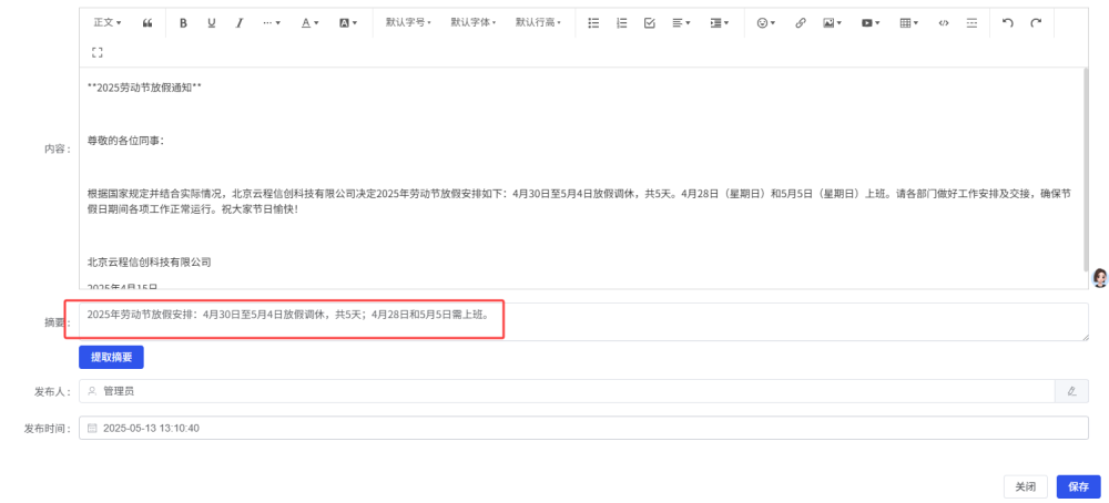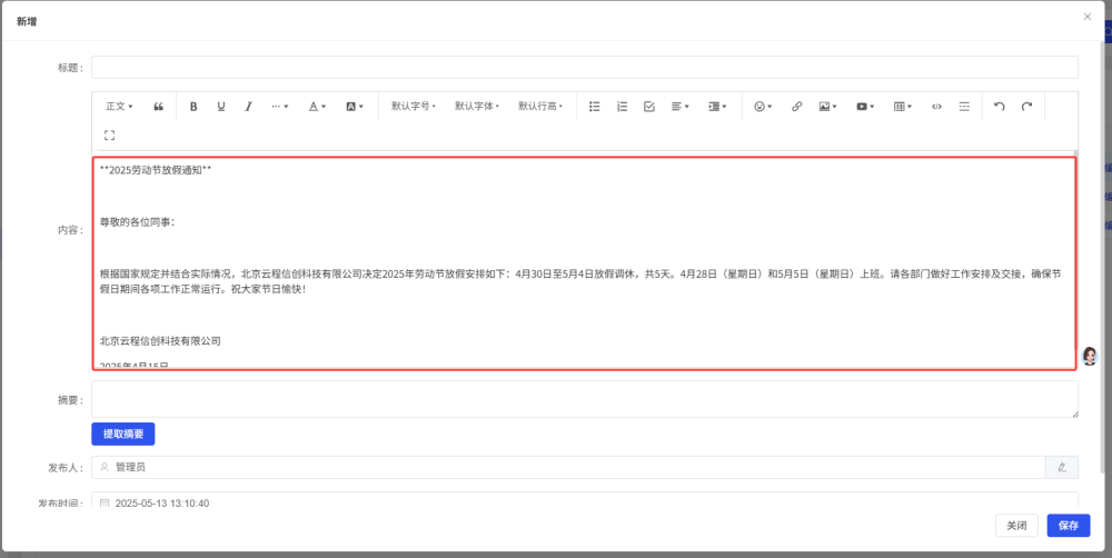 - 自动化内容生成:基于模板与自然语言处理(NLP)技术,快速生成标准化通知公告,减少人工干预(如示例中的“劳动节放假通知”)。