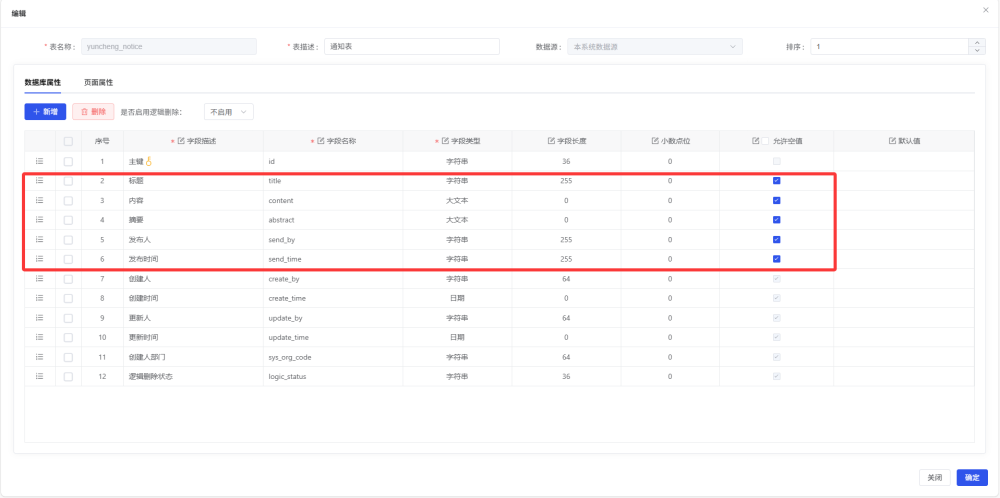 在实体模型设计模块中,创建【通知表】,该表包含以下字段: