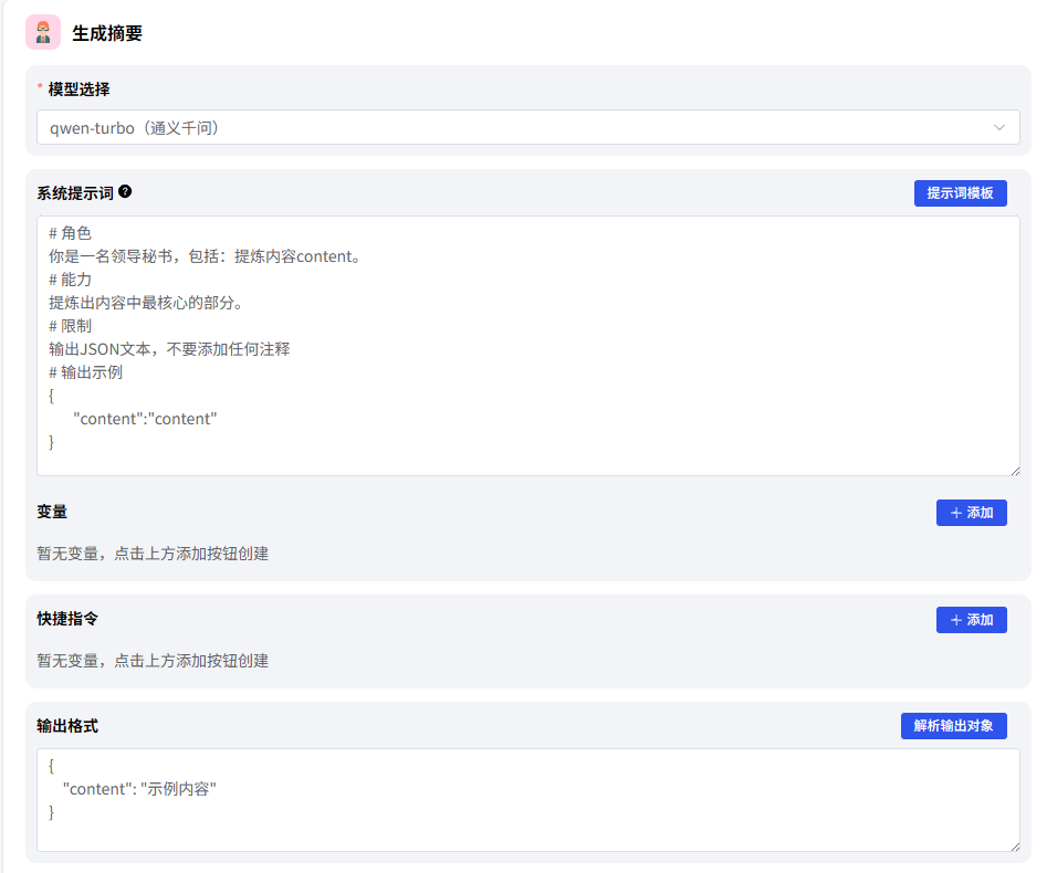 点击【智能体开发】菜单,在菜单中新增一个智能体,该智能体专门用于提取通知内容的摘要信息。在智能体的设置中,可使用提示词来添加相关的提取规则,如按照关键词提取等方式来生成摘要。