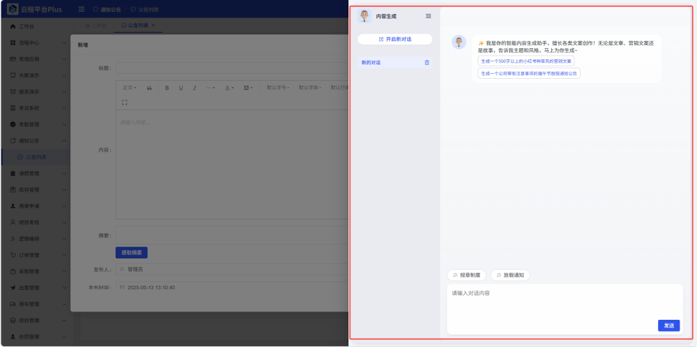 在数字化转型的浪潮下,传统业务流程(如通知公告管理、文档处理等)仍依赖人工操作,面临效率低、成本高、易出错等问题。以企业通知公告为例,从内容撰写、摘要提炼到信息分发,需耗费大量人力与时间,且存在格式不规范、信息遗漏等风险。随着市场竞争加剧和业务规模扩大,传统模式已难以满足企业对高效、精准、灵活的业务需求。