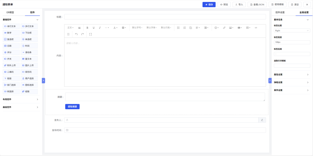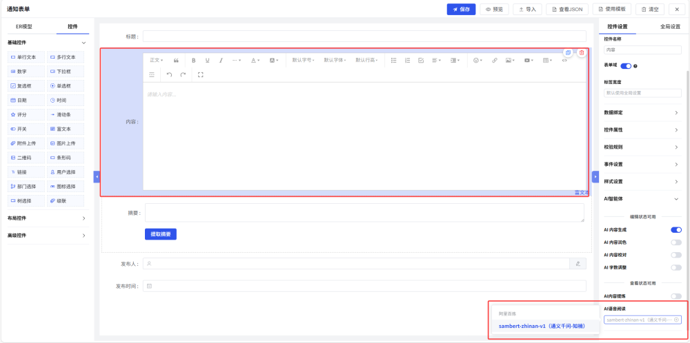 回到表单设计器,在【内容】控件上,配置【AI 智能体】中的【AI语音阅读】选项。这样,当用户在表单中编辑通知内容时,可借助 AI 智能体的功能来辅助生成内容。