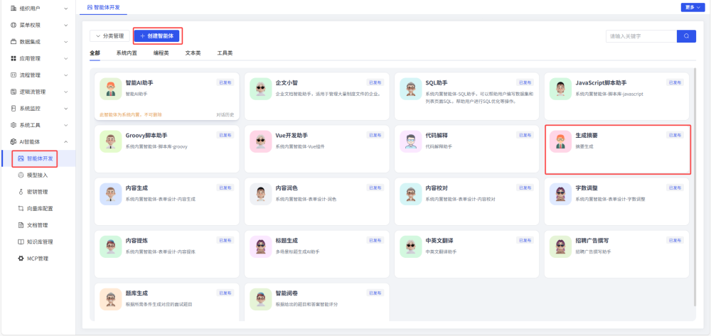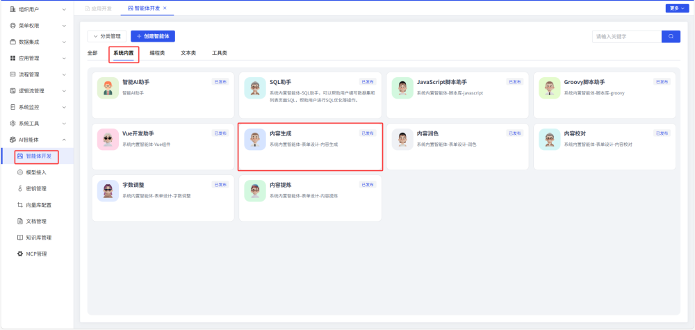 点击【智能体开发】菜单,然后选择【系统内置】中的【内容生成】智能体,进入智能体配置界面。