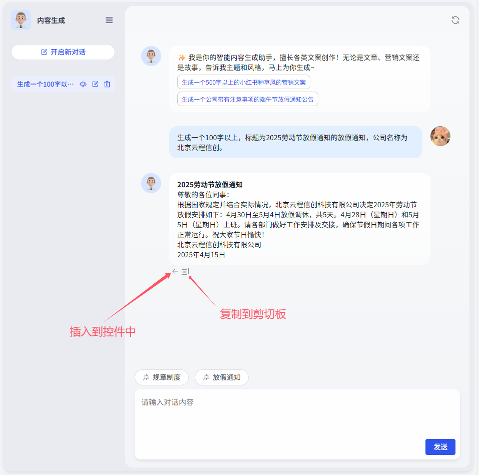 在 AI 智能体对话框中,找到并点击放假通知相关的【快捷指令】,在出现的输入框中填入通知的标题,如 “2025 年劳动节放假通知” ,然后点击 【发送】按钮。