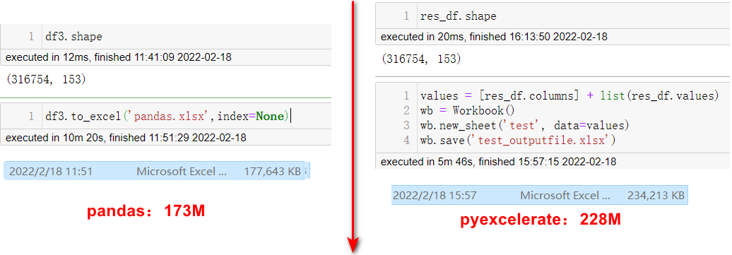 1、从时间看:pandas处理10m20s,pyexcelerate处理5m46s,pyexcelerate速度完胜,节省几乎一半时间。