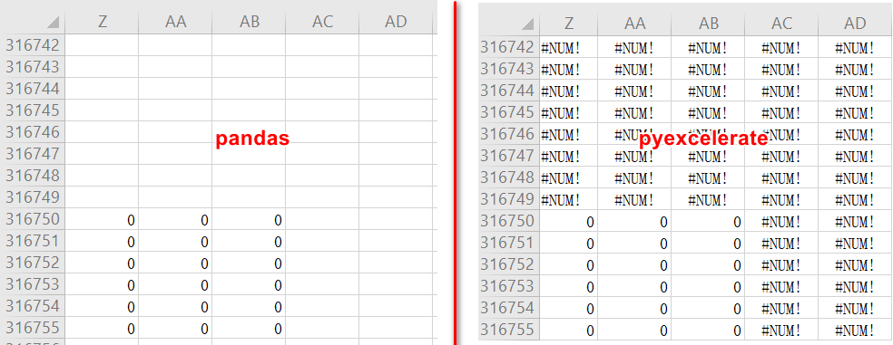 3、从数据质量看,pandas空数据NA,excel显示正常,pyexcelerate空数据,无论数值型还是文本型,均显示#NUM!,pandas完胜。