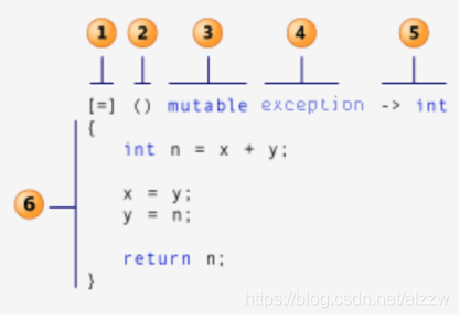 即:[函数对象参数](操作符重载函数参数)mutable或exception ->返回值{函数体}