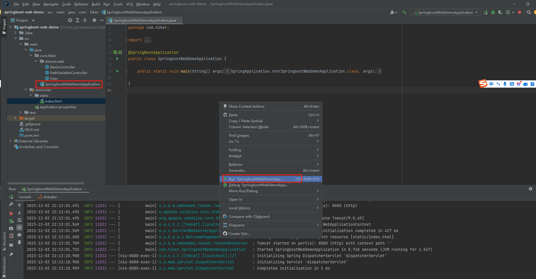 在springboot的启动类右键运行,再打开浏览器输入:http://localhost:8080/ 即可访问新建的springboot项目。