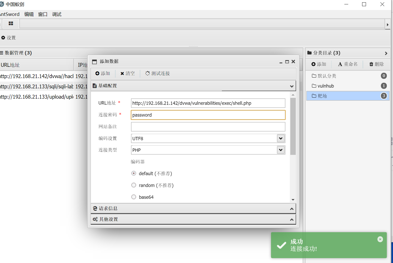 此处除数字报错显示为成功,伸下来就蚁剑直接链接就可以,密码为password