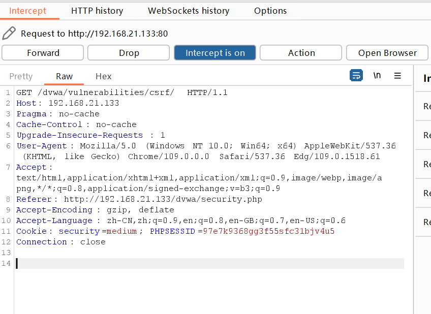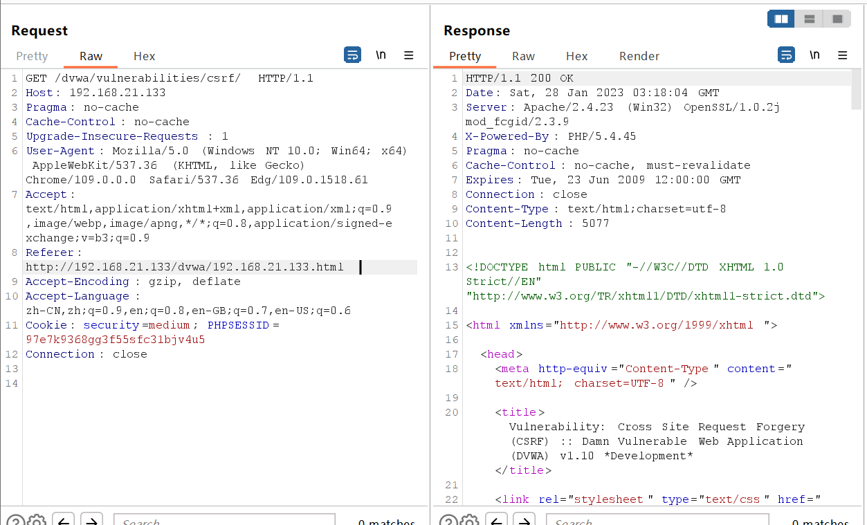 进入repeater模块,修改referer为http://攻击机的服务器地址/dvwa/被攻击ip地址.html(攻击机利用的服务器和靶机就直接是一样的)