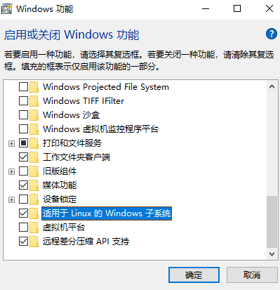 第一种:在控制面板-程序-启用与关闭Windows功能中,勾选“适用于Linux的Windows子系统”