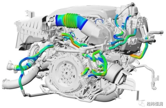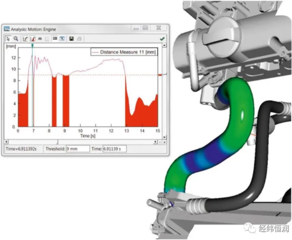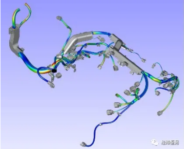 可对运动部位的管线实时仿真,动态展示管线的空间变形、弯扭状态以及应力分布,公差分析,生成扫掠体积模型,同时针对管线上卡扣卡箍等固定点的受力分析。进行发动机周边管线的振动及疲劳分析。