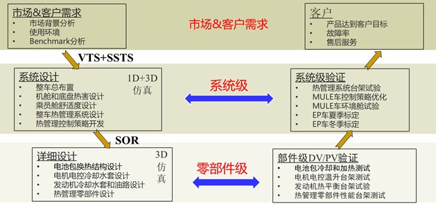 根据需求梳理结果,设计多种满足需求的系统架构,搭建热管理系统模型,通过仿真对热管理系统架构和零部件选型方案进行验证和优化。进行整车多学科全系统模型与优化平台集成,实现多目标优化、多属性平衡分析和控制算法设计优化。