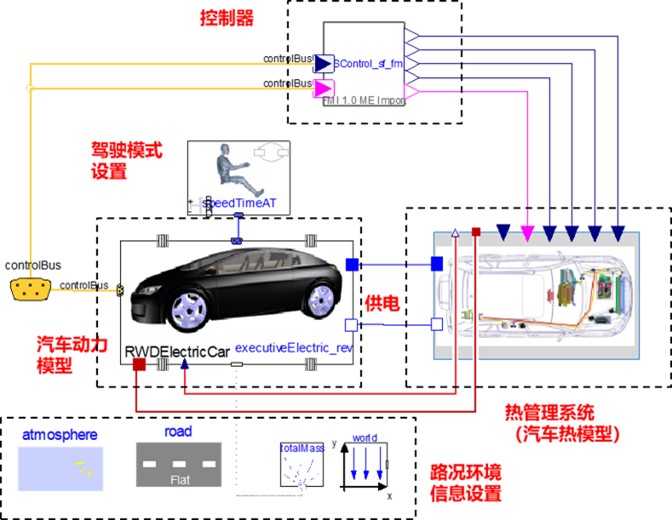 搭建整车多学科模型,含整车动力学模型、热管理系统和热管理控制。根据多学科联仿模型,分析不同循环工况下如何控制压缩机转速、水泵转速、风扇转速、PTC加热量等来满足设计指标要求,进行热管理控制策略设计。