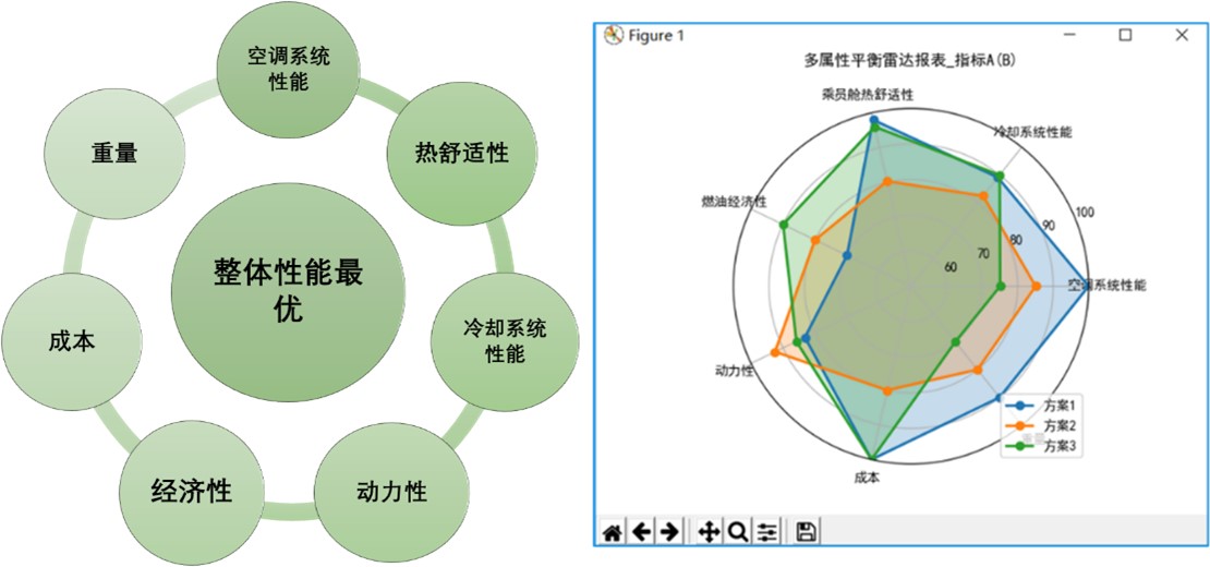 将整车多学科模型与优化平台结合,从多个维度进行优化,如空调系统性能、冷却系统性能、人体热舒适度、重量和成本等等,通过自研平衡分析软件对优化帕累托解集进行平衡分析,选取较优方案,提升整车属性评分。