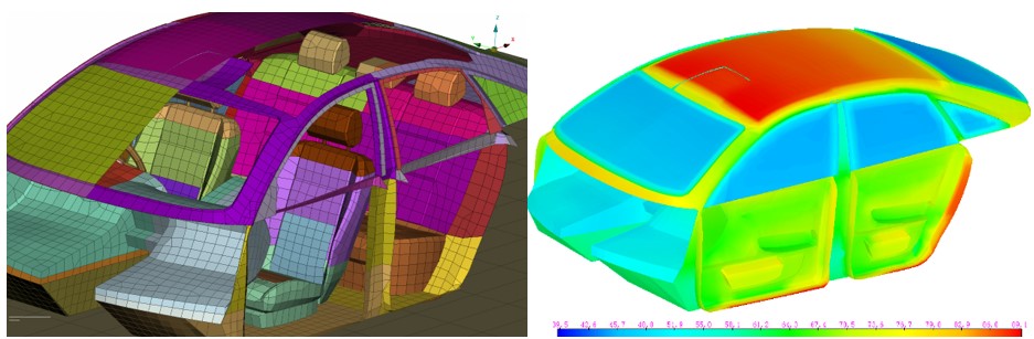 根据整车各零部件材料属性,搭建乘员舱热模型,加载环境试验地点天气文件,如三亚、漠河、吐鲁番等,进行乘员舱热分析。根据分析结果,指导车身热设计,如车门、车顶选材,隔热材料厚度、玻璃的透射性能等等。