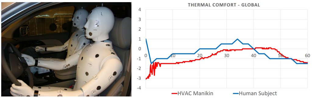 HVAC假人测试方案,可获得测试时间历程人体局部和整体热舒适度、冷暖感矩阵、PMV、PPD、体感温度、DTS(Dynamic Thermal Sensation)等多种舒适性评价维度结果。假人测试系统,包含46组温度、风速和热辐射传感器,4个相对湿度传感器,采用环氧碳纤维外壳,为西方或亚洲男性平均身材,支持不同身材比例定制。肩部,臀部,膝盖,肘部及脚踝都有关节连接,与座椅进行更好的贴合。