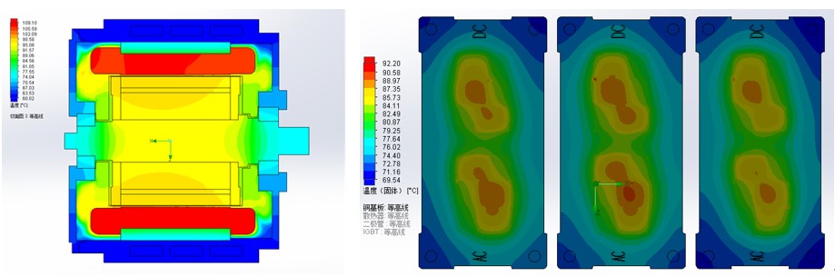 创建电机电控产热模型,搭建完整的电机、电控热流耦合分析模型,根据热分析温度场结果,进行散热方案设计,如电机冷却水套优化、控制器水冷风冷散热结构设计优化等。