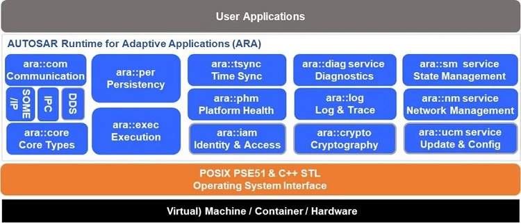 INTEWORK-EAS-AP是经纬恒润完全自主研发的Adaptive AUTOSAR解决方案,遵循AUTOSAR Adaptive R19-11规范,使用C++11语言和 POSIX操作系统,除实现诸如诊断(UDS和DOIP)、面向服务通信(SOMEIP)、网络管理、数据持久化等基本功能外,还实现了执行管理、平台健康管理、状态管理、配置及更新管理、加密管理等高级功能。
