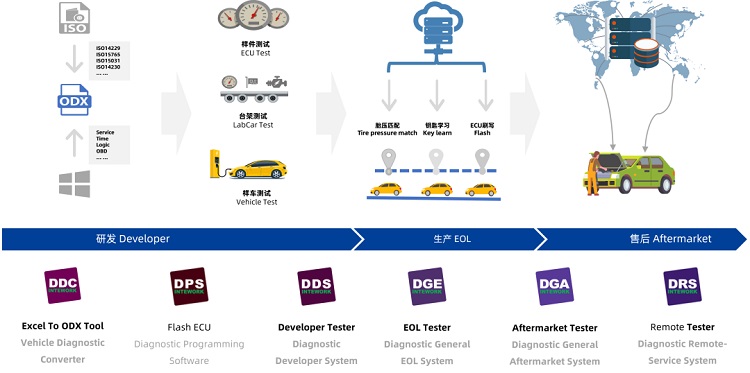 经纬恒润针对汽车诊断业务中研发、测试、生产及售后等全业务场景,结合十余年诊断项目经验及行业发展趋势,自主研发了基于ODX标准的“D”系列诊断工具链产品,可涵盖诊断数据(ODX)开发、诊断序列(OTX)搭建、刷写、测试、控制器诊断模拟、EOL诊断、售后诊断等多方位需求。其中DGE、DGA及DRS三款产品均包含服务器云平台及终端软件,服务器云平台可对车型诊断数据、故障码、操作日志等进行管理,包括对站点、工位、用户权限等进行维护以实现权限安全管控。用户可针对不同的功能需求及使用场景,灵活部署、应用不同的诊断工具产品。