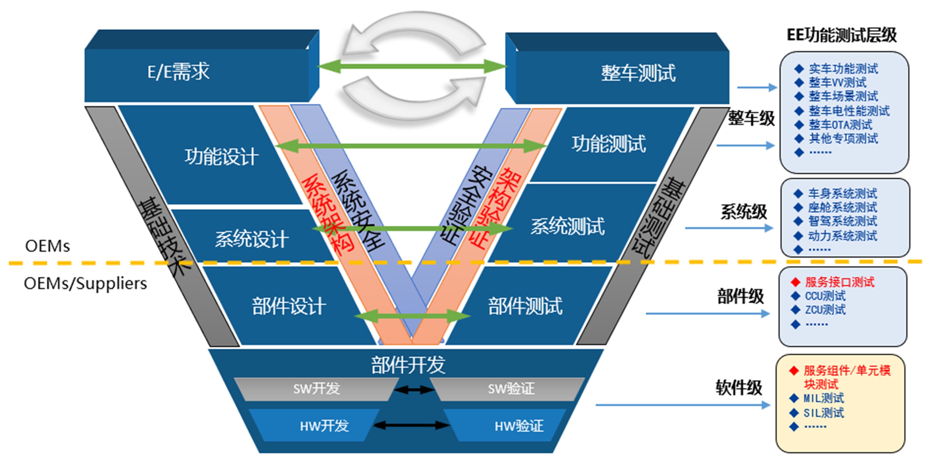 伴随整车电子电气开发V 流程的新增内容,面向不同的测试对象和测试团队,形成从SOA软件级到整车场景级的全链路测试解决方案。