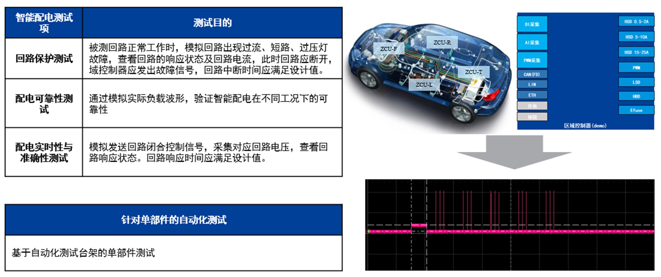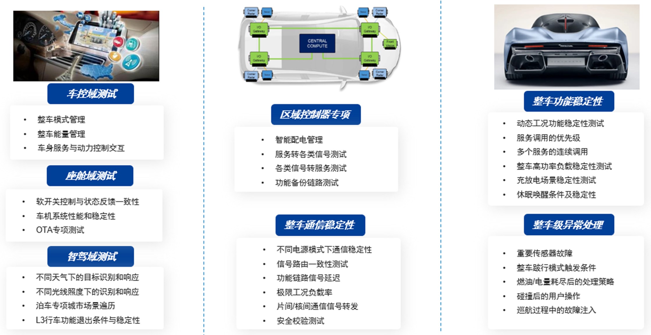 重点分析新架构车型电子电气系统的差异性,形成专项测试解决方案。如中央域控相关的SOA服务接口测试(含服务功能、性能测试)、区域控制器ZCU相关的智能配电测试、高阶智驾域控的NOA专项道路测试等。