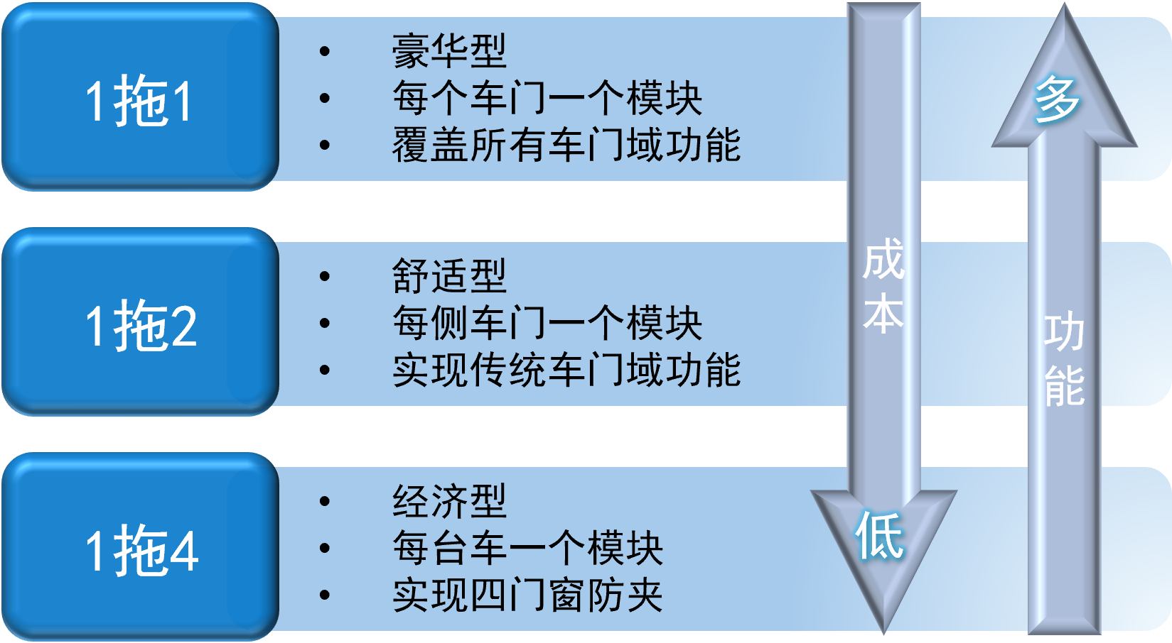经纬恒润在门模块产品上共有 1 拖 1、1 拖 2 和 1 拖4 三种解决方案,可供经济型、舒适型、豪华型等不同级别车型在功能和成本间作出选择。