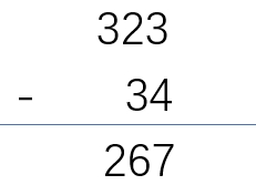 323-34=?3-4不够,所以要借位,看加法表4+?=13,是7,2借了一位就是1,1-3也不够需要借位,3+?=11,是6,最后的3借了一位就是2,结果是267