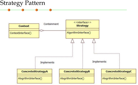 Strategy:通过委托实现。通过对于Context的某个方法,希望以不同的方式实现,但如果把实现逻辑写死在Context中,则更改不便,因此选择方法中传入一个代表策略(Strategy)的接口,通过在不同ConcreteStrategy中重写方法,可以根据需要,通过传入不同对象选择策略,同时实现代码的分离。
