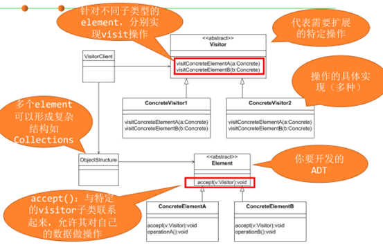 Visitor:通过双向委托实现。被查看的对象有许多种,发起查看的对象有许多种。被查看对象的accept函数需要接受visitor;发起查看的对象需要基于被查看对象进行。