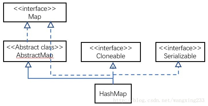 HashMap和Hashtable不仅作者不同,而且连父类也是不一样的。HashMap是继承自AbstractMap类,而HashTable是继承自Dictionary类。不过它们都实现了同时实现了map、Cloneable(可复制)、Serializable(可序列化)这三个接口