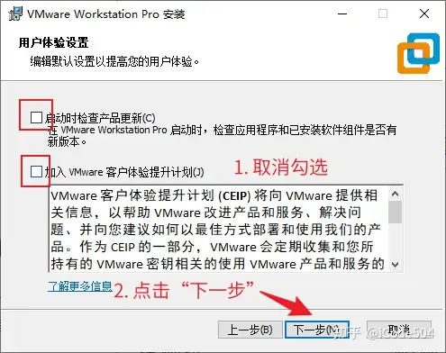 4. 用户体验设置页面,取消勾选启动时检查产品更新和加入VMware客户体验提升计划,完成后点击下一步: